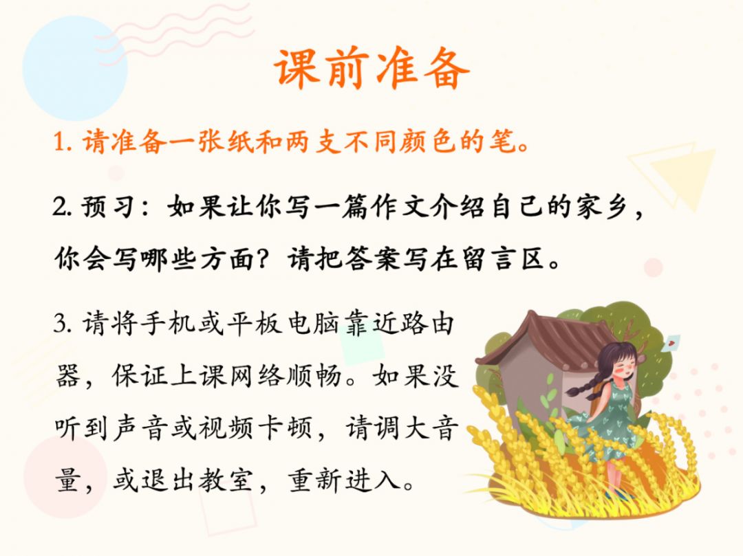 比如說這節(jié)課是下午三點開始,在2點50的時候,您就可以上線了,您可以提前10分鐘做一張PPT,把今天的預(yù)習(xí)內(nèi)容,以及網(wǎng)絡(luò)條件怎樣才能保持通暢的注意事項發(fā)給孩子們。