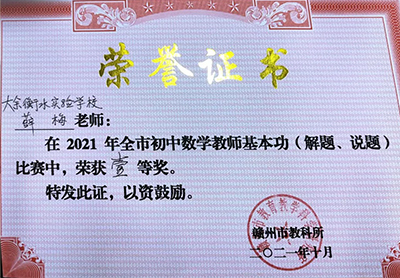 在剛落下帷幕的2021年贛州市初中數(shù)學(xué)青年教師基本功暨“解題·說題”比賽中,我校薛梅老師榮獲全市...