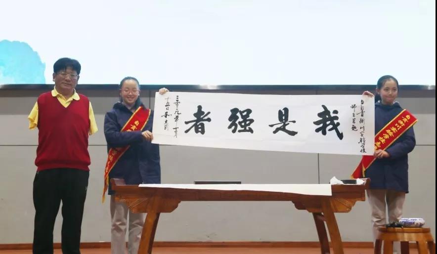 隨后,和老師現(xiàn)場(chǎng)揮毫潑墨,獲得了師生雷鳴般的掌聲。這掌聲是為其遒勁書(shū)法,更為其勵(lì)志人生。