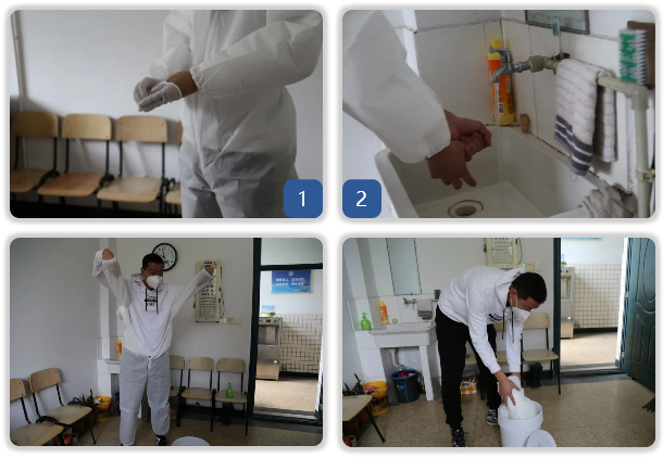安全應急處置和引領(lǐng)負責人趙老師按照規(guī)定和程序脫掉和處理防護用品。
