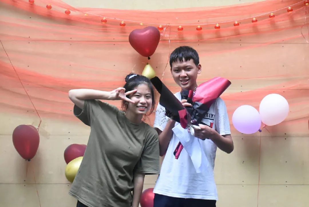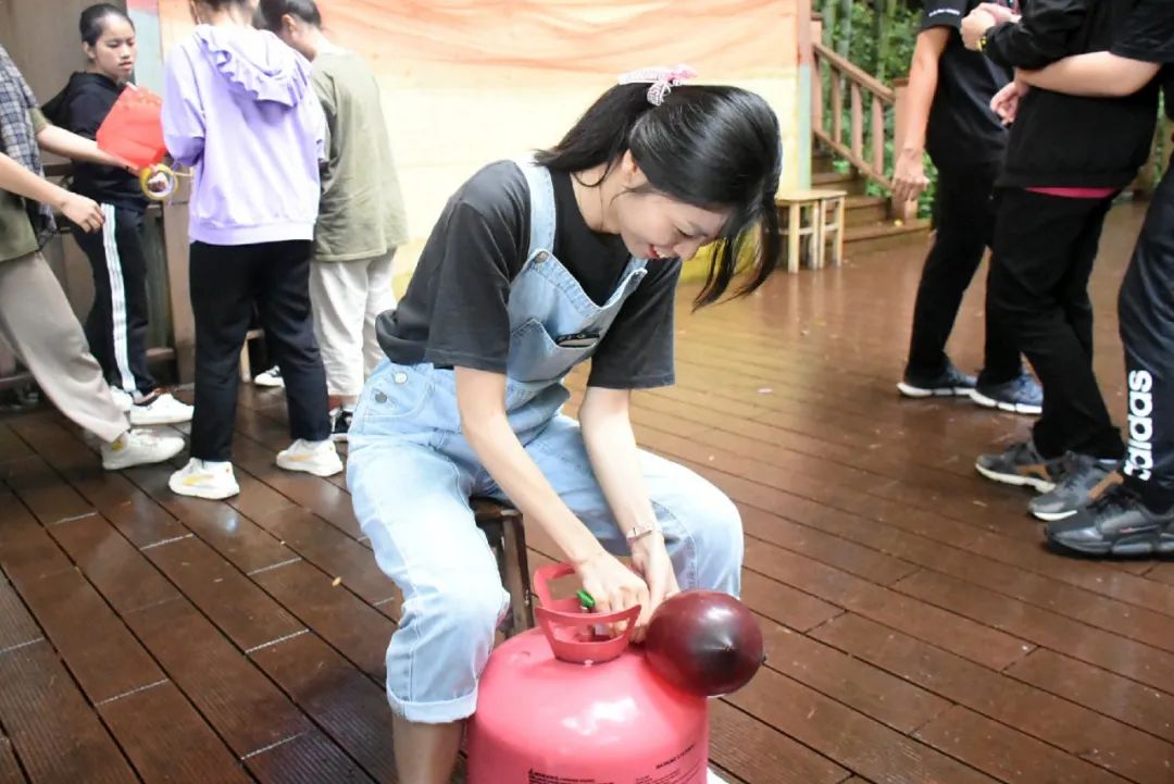 同學們隔著一米半圍成圈看著老師“危險”操作——打氫氣球,正喜悅第一個氣球終于慢慢膨脹起來了,轉(zhuǎn)眼間便搖搖擺擺地飄上了天空,引來一片唏噓,接二連三地,氣球仿佛都通了氣似的,比起被束縛,更向往無邊無際的藍天。小伙伴們只得小心翼翼地把氣球接到手上,轉(zhuǎn)圈,打結(jié),系繩,綁石頭,同學們分工合作。不一會兒,舞臺布滿了五彩斑斕的氫氣球,我們創(chuàng)造出了斑斕絢麗的舞臺,成就感油然而生。