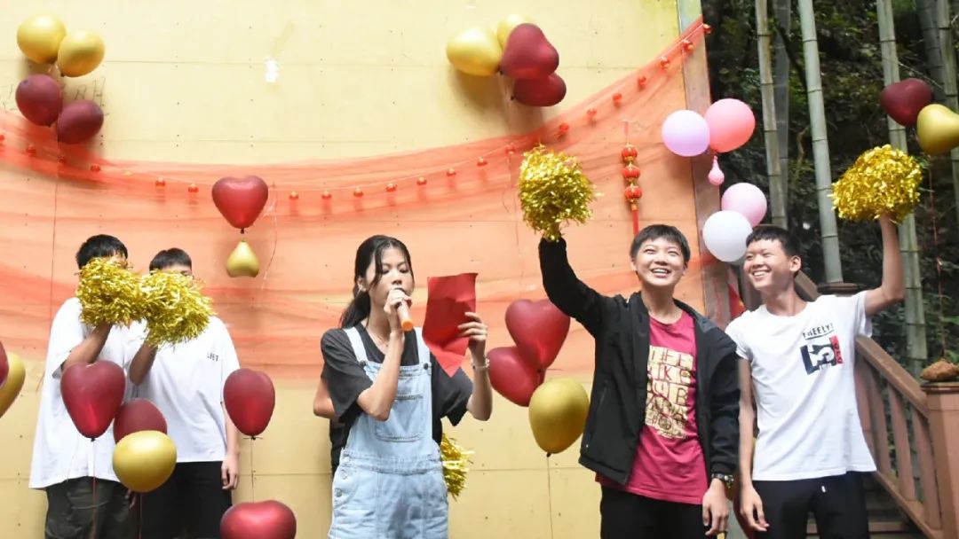 吃飽喝足便是節(jié)目表演環(huán)節(jié),老師的《日不落》活躍氣氛,現(xiàn)場成為打歌舞臺,輕快酷炫的rap讓大家飽享耳福,搞笑有趣的廣西版《有何不可》讓大家捧腹大笑,熟悉的歌謠使得在底下的觀眾情不自禁地跟唱起來,小伙伴們組成一個個小團隊,在舞臺散發(fā)著獨具特色的光芒,歌聲夾著尖叫聲,打call聲響徹丫山,送花合影讓我們更親密了,每個人的臉上都洋溢著笑容,負責接送我們的劉老師最后也按捺不住了,唱起了動聽的經(jīng)典歌曲《濤聲依舊》和《橋邊姑娘》。