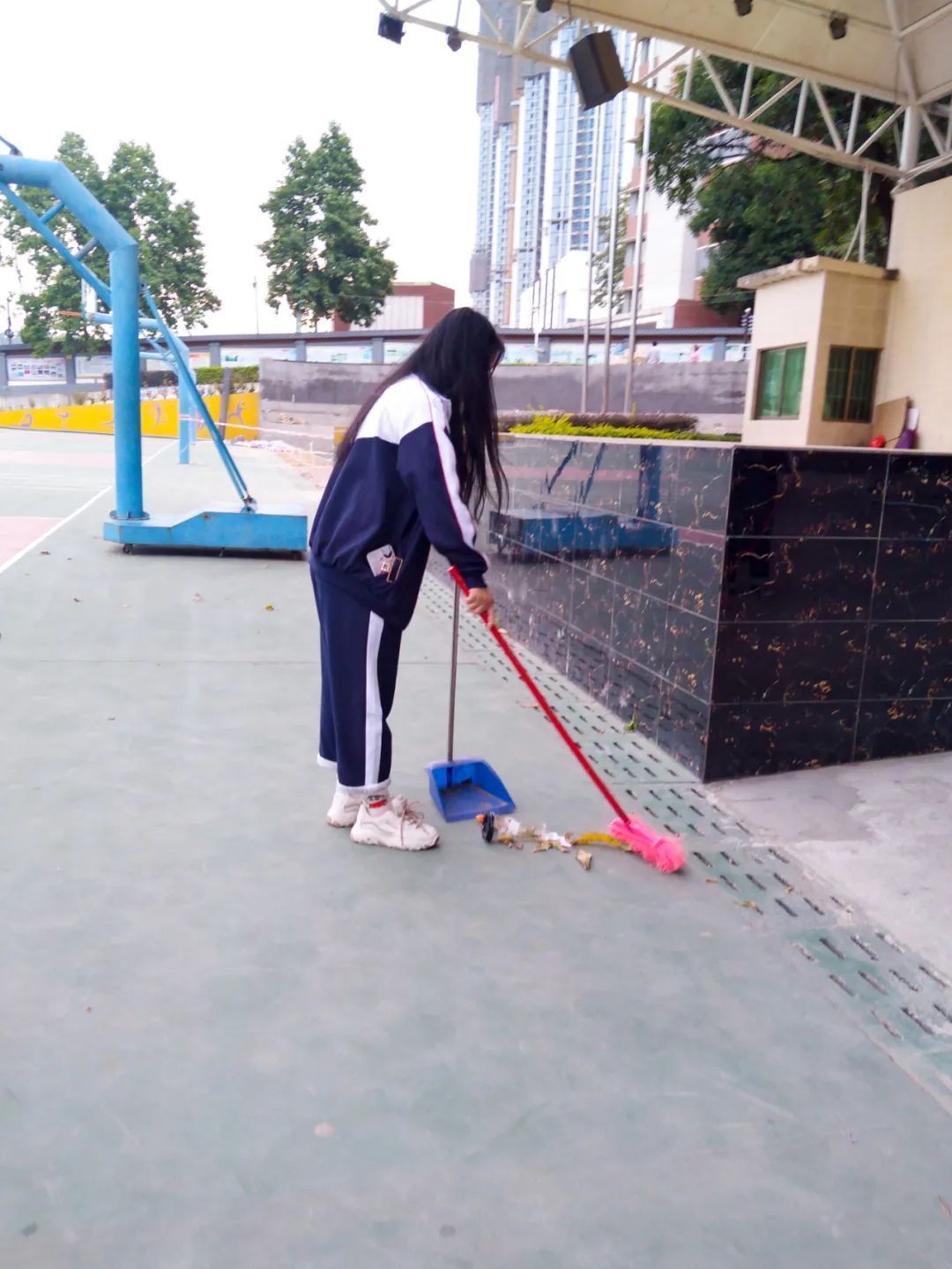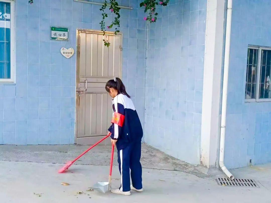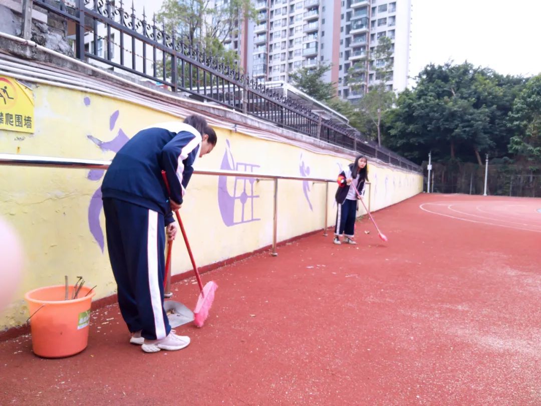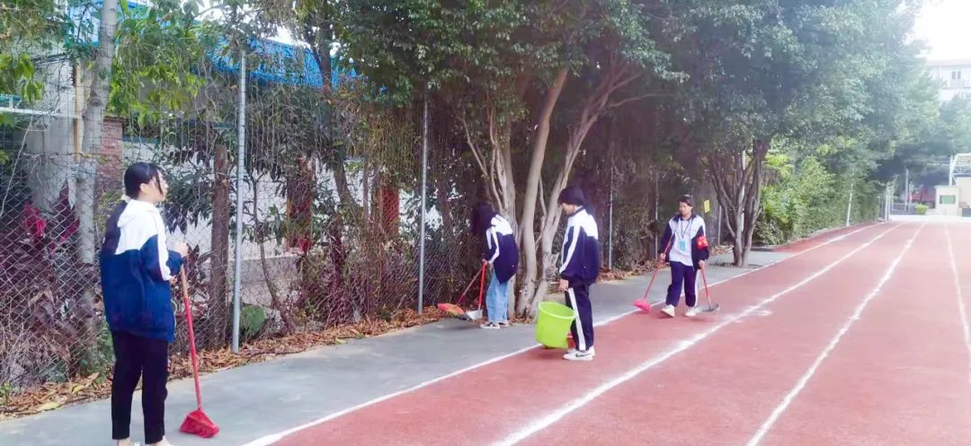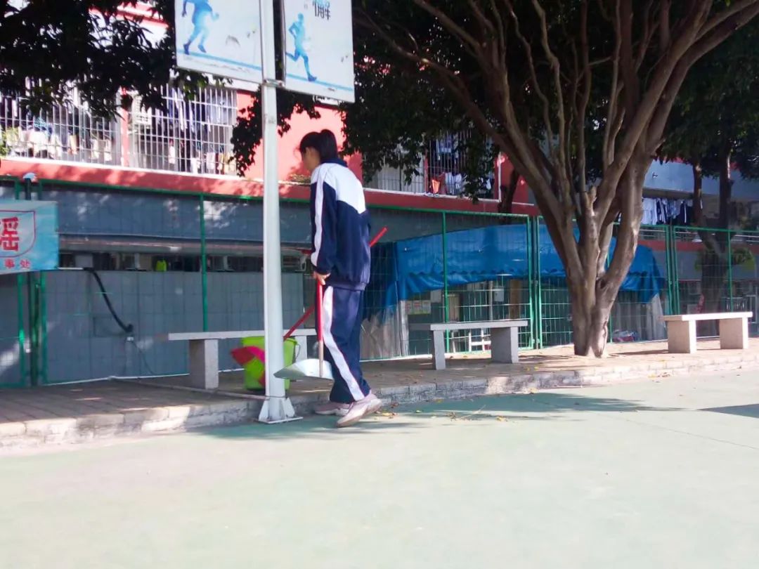 提前到達(dá)操場(chǎng)的是王廷榮、黃詩(shī)文、李仁懷、李燦彬、溫善媛等同學(xué)。他們揮動(dòng)著掃把便開始“沙沙”地清掃落葉,掃地的聲音好像鳥兒在對(duì)他們唱歌,又像是在鼓勵(lì)他們:“勞動(dòng)的孩子最美麗”。