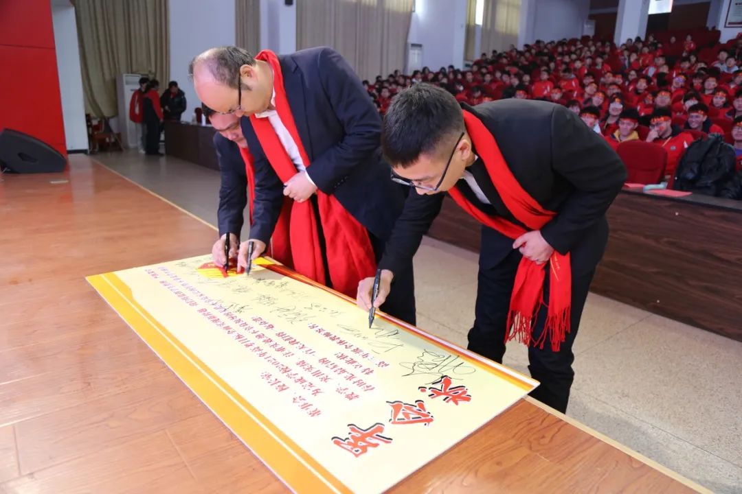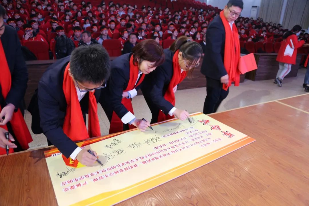 隨后,全體高三教師在張朝老師的帶領下簽軍令狀并宣誓。不負使命,認真工作,甘為人梯,培育棟梁,關愛學生,創(chuàng)造輝煌,千淘萬漉雖辛苦,吹盡狂沙始到金,這就是高三教師的不變承諾!